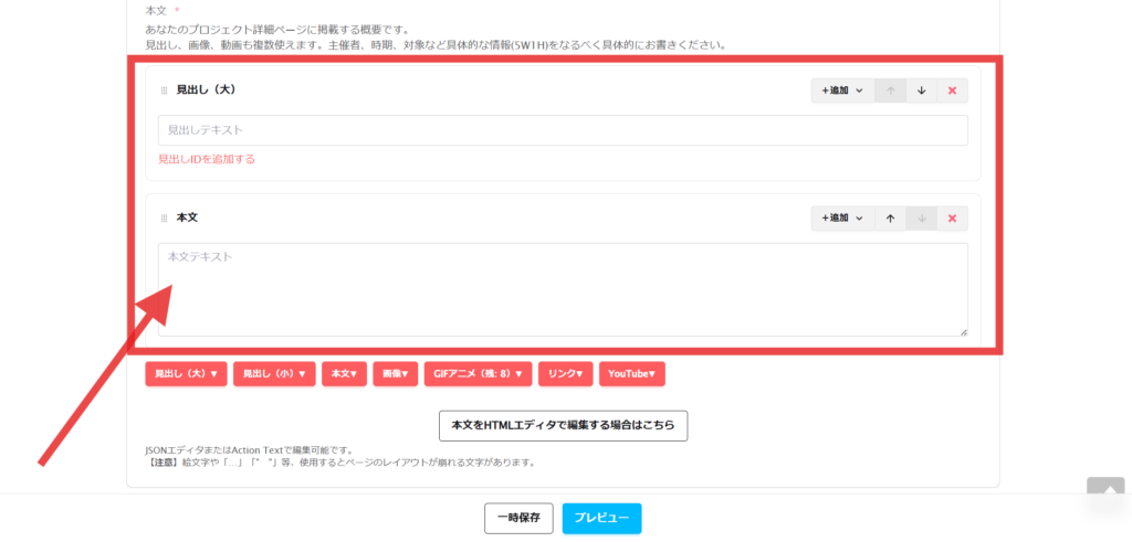 - 「プロジェクトページURL#見出しID」というURLを開くと、その見出しの位置に直接移動することができます。また、「リンク」にこの見出しIDを設定することもできます。詳しくは「本文>リンク」の欄をご覧ください。