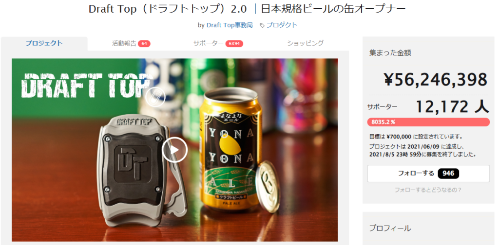 現在、日本規格の缶にあわせた「日本版Draft Top2.0」を開発中。目標金額70万円達成でその量産が決定します。