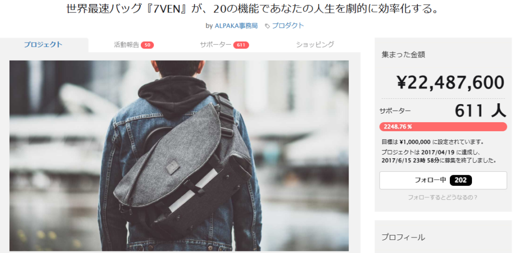 きびたんのプロジェクト「7VENメッセンジャーバッグ」も、Facebook広告で非常に多くの反響があり、プロジェクトは2,000万円を突破しました。